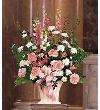 This pink and white arrangement, with its chrysanthemums, larkspur and snapdragons, is perfect to display your heartfelt sentiments.