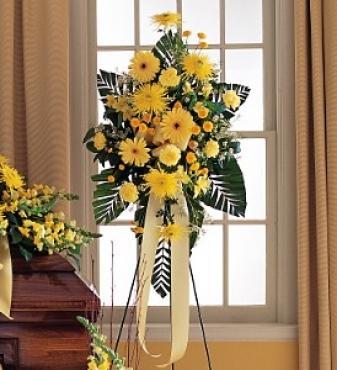 Eloquently express your sympathy with this stunning floral arrangement of yellow alstroemeria, carnations, chrysanthemums and gerberas.