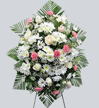 Express your deepest sympathies, and extend a gracious note to a service or memorial, with this soft spray of pink and cream blooms surrounded by a frame of elegant greens.