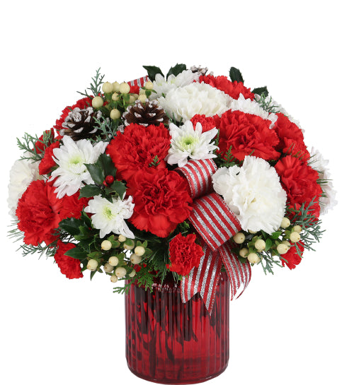 Spread the cheer and Deck the Halls with our original design! A glass vase arranged with red carnations, miniature carnations, white chrysanthemums, white hypericum berries, frosted pine cones and a pretty festive red and silver bow.