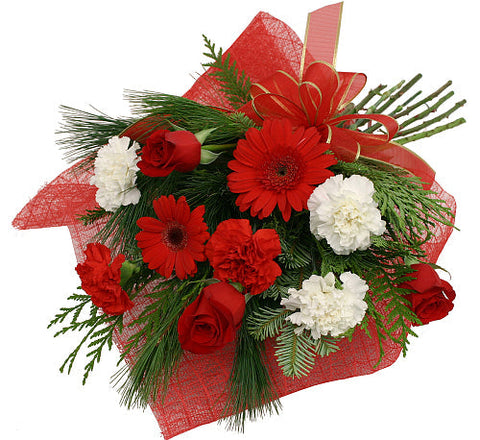 Give your best wishes for a wonderful Holiday this year with this festive bouquet. Red and white flowers arrive nicely wrapped with Christmas greens and a red bow. Featuring a clever mix of red roses, red Gerbera daisies plus red and white carnations. Perfect!