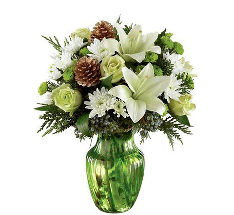 Combining cabin chic with luxurious beauty, our hand-crafted gathering of fresh roses and lilies, button poms, carnations, and assorted fragrant greens is finished with pinecones and seasonal greenery designed in a glass cube vase for a breezy mix of exotic and modern.