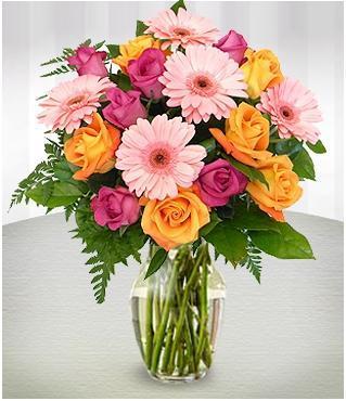 • The arrangement includes six yellow or orange roses, six pink roses and five pink gerbera daisies with greens