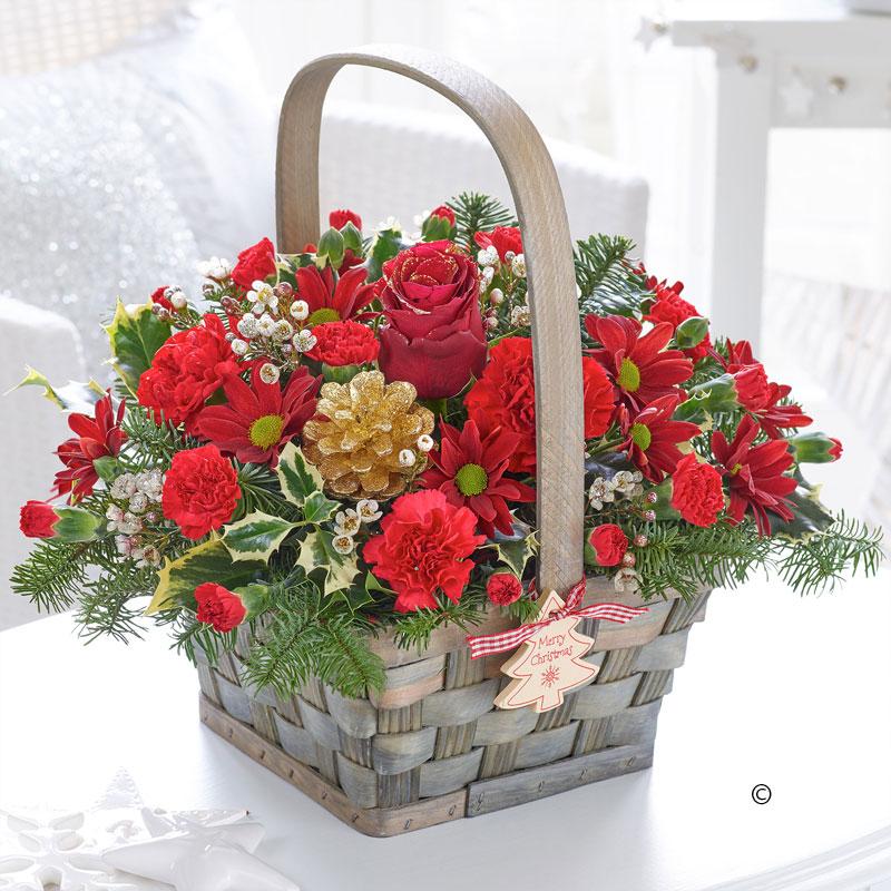 Make them merry with this sweet basket arrangement! Red carnations and daisies are beautifully presented in this Christmas gift. Send a sweet holiday message with this seasonal basket!